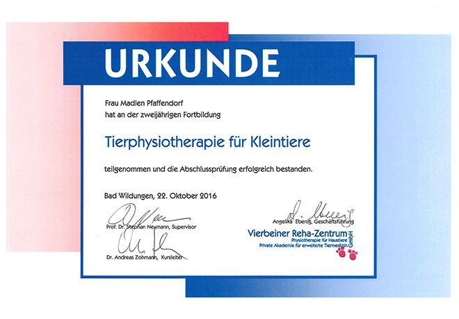 Mein Name ist Madlen Wagner (ehem. Pfaffendorf). Seit 2012 bin ich als ausgebildete Tiermedizinische Fachangestellte in der Fachpraxis für Kleintiere Nils Olma & Gunter Zeise tätig. Im Jahr 2014 begann ich mit meiner zweijährigen Ausbildung zur Physiotherapeutin für Kleintiere im Vierbeiner Reha-Zentrum Bad Wildungen.